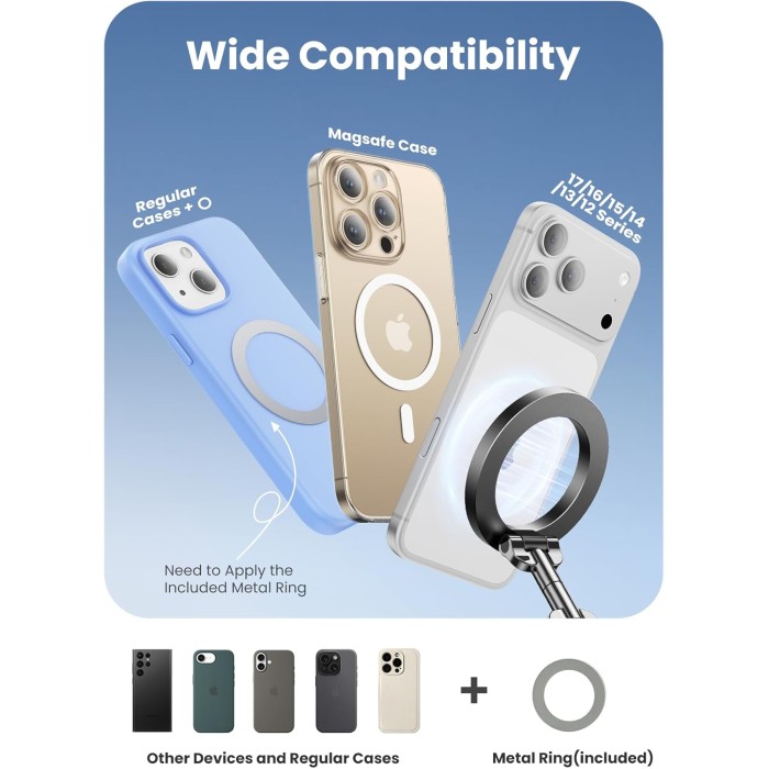 - [Wide Compatibility] Dawinga magnetic phone holder for car is compatible with iPhone 17/16/15/14/13/12 series and all MagSafe-enabled devices. Includes an adhesive metal ring for non-MagSafe phones or cases, ensuring strong magnetic attachment. Fully compatible with Android phones such as Samsung, Google Pixel, and LG. For optimal adhesion, allow the adhesive ring to cure for 30 minutes before use.