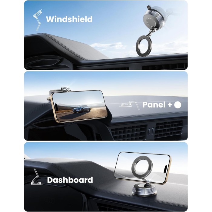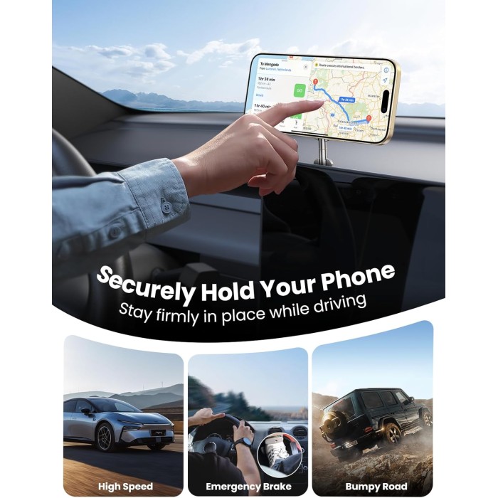 - [Multi-Surface Versatility] Combining nano-gel, vacuum suction, and magnetic technology, the phone mount for car adapts to multiple scenarios. It attaches securely to flat surfaces such as car dashboards, windshields, and windows—ideal for mounting behind your Tesla Model Y display! For uneven surfaces, simply use the included adhesive pad for a strong, reliable hold.