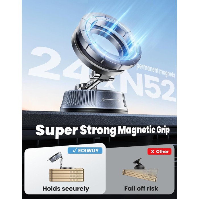 - [Powerful Magnetic Force] Built with 24 premium N52 magnets, our car phone holder provides stronger magnetic strength compared to standard holders. The enhanced magnetic pull keeps your phone firmly in place, even on bumpy roads, sharp turns, or sudden stops—so you can drive with confidence and without worrying about drops.
