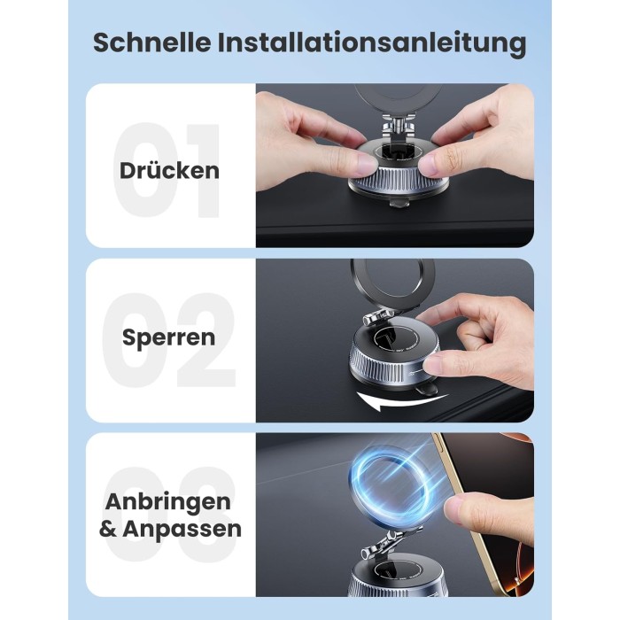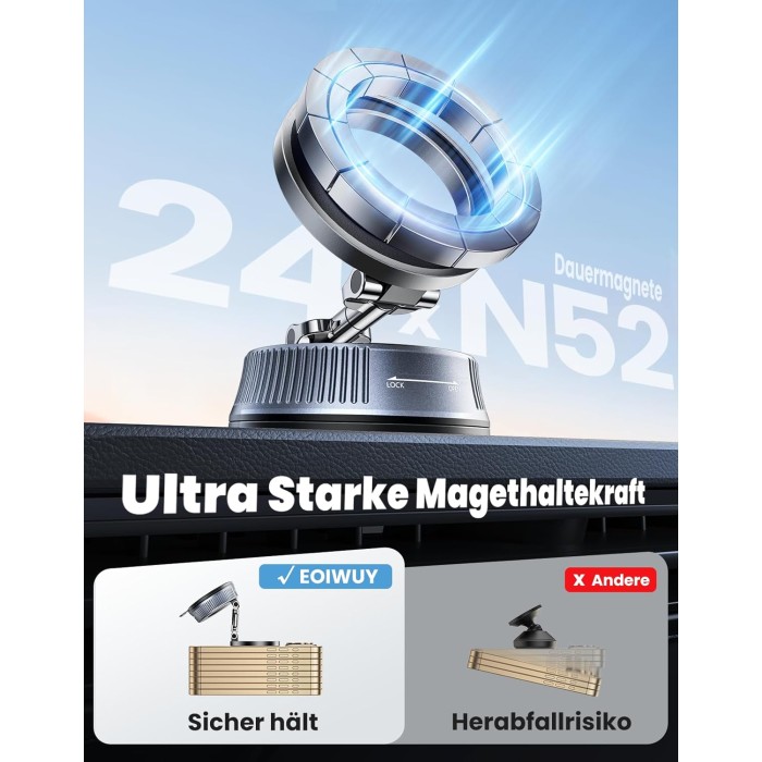 - [Leistungsstarke Magnetkraft] Unser Magnet Handyhalterung fürs Auto ist mit 24 Premium-N52-Magneten ausgestattet – im Vergleich zu Standardhaltern bietet er so eine stärkere Magnetkraft. Der verstärkte Magnetzug hält Ihr Handy fest an Ort und Stelle, selbst auf unebenen Straßen, bei scharfen Kurven oder plötzlichen Bremsungen. So können Sie sicher fahren, ohne sich um ein Herunterfallen sorgen zu müssen.