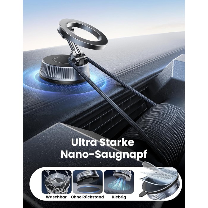 - [Breite Kompatibilität] Die Handyhalterung Auto Saugnapf ist mit iPhone 17/16/15/14/13/12-Serien sowie allen MagSafe-fähigen Geräten kompatibel. Für Nicht-MagSafe-Handys oder -Schutzhüllen ist ein klebbarer Metallring im Lieferumfang enthalten, um eine starke magnetische Verbindung zu gewährleisten. Sie unterstützt zudem alle Android-Handys, wie für Galaxy, Google Pixel und LG-Modelle. Für optimale Haftung lassen Sie den Klebemetallring vor der Nutzung 30 Minuten aushärten.