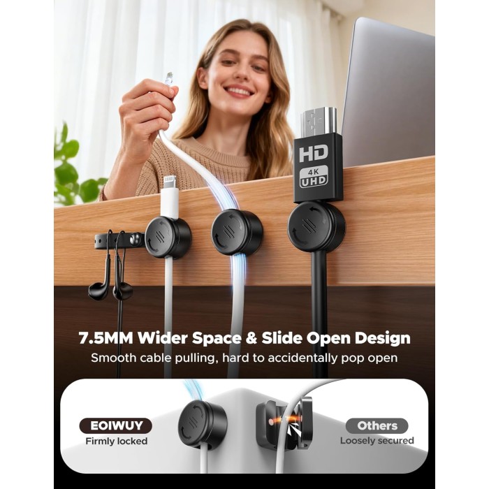 - 360°-Seiten Schiebeöffnung & Upgrade Magnetverschluss: Im Gegensatz zu anderen Kabelhalter Schreibtisch kombiniert der EOIWUY einen verstärkten Magnetverschluss und ein 360°-Seiten-Schiebeöffnungsdesign mit einem ultrahaftfesten Acrylklebefolien. Dadurch bleiben Ihre Kabel auch bei starken Zugkräften sicher an Ort und Stelle und springen nicht leicht heraus. Sie können das gewünschte Kabel nach Belieben sanft herausziehen.