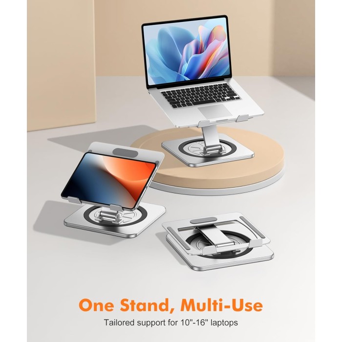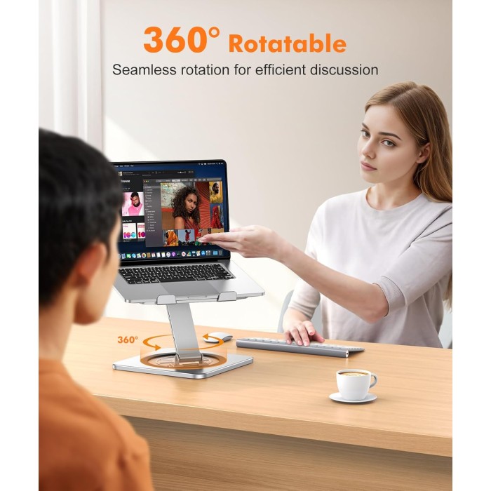 - [Dynamic 360° Swivel] Experience the dynamic power of our adjustable laptop stand's seamless 360-degree rotation, providing unmatched flexibility in your working position. Effortlessly share your screen with colleagues or friends, whether you're presenting in a meeting or collaborating on a project.